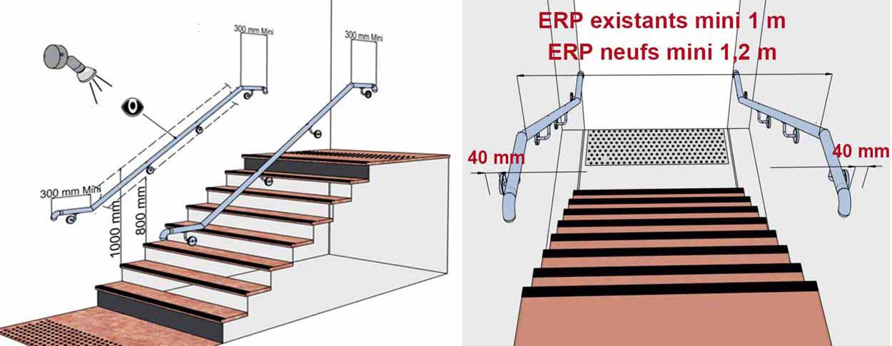 Dans les ERP existants, cet espace doit être de 1 mètre . Si la largeur de l'escalier n'est pas suffisante, de sorte que l'installation d'une seconde main courante réduit l'espace à moins d'un mètre, équiper un seul côté est conforme.